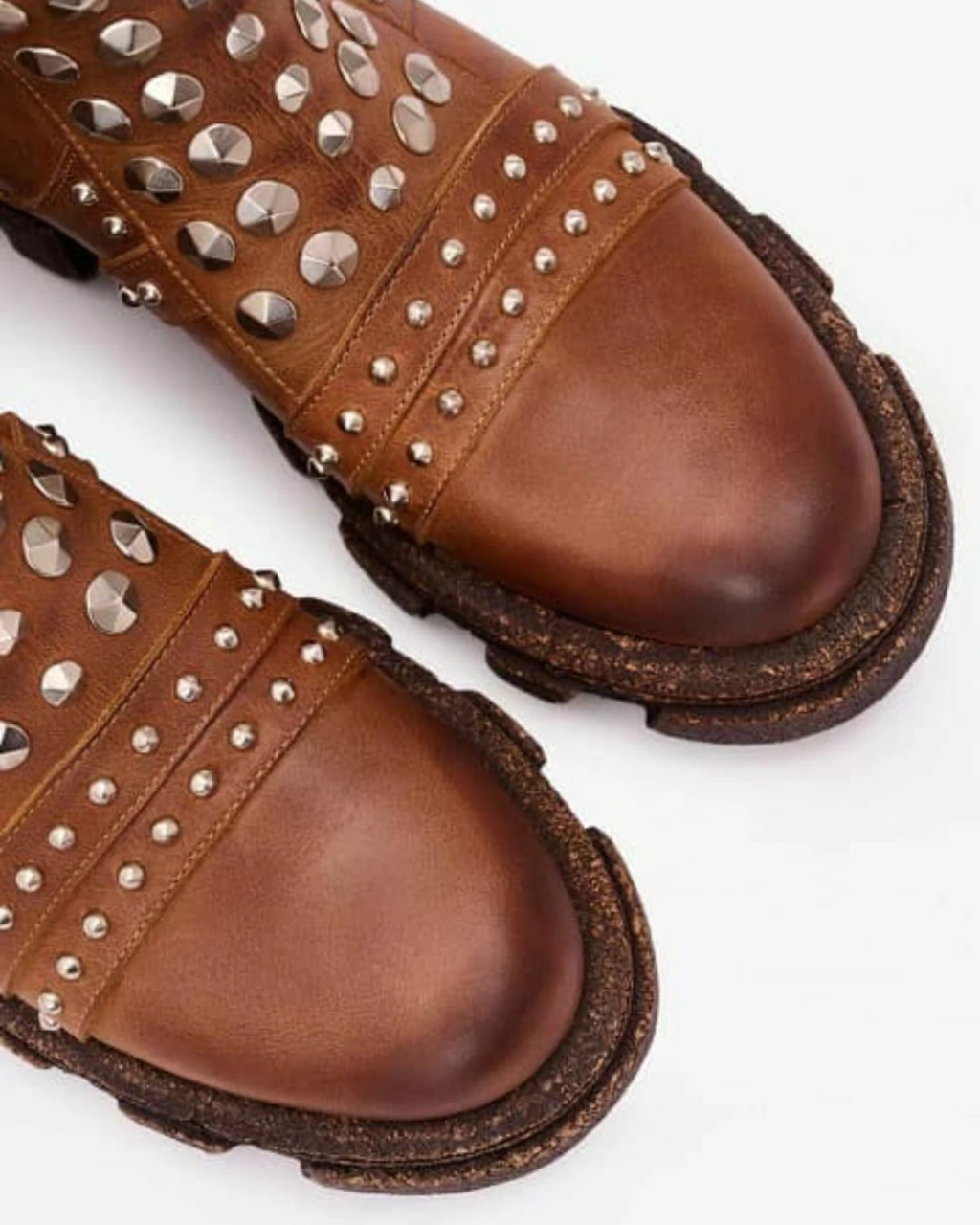 Tiene tachas cónicas y bombé en color níquel que le suman mucha onda, y acceso con cierre lateral interno.
