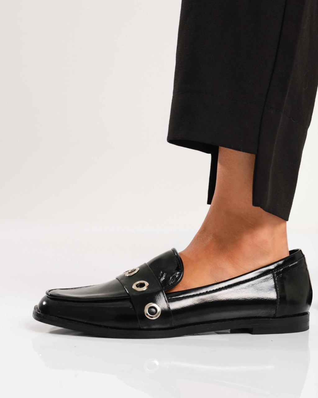 Estos mocasines de cuero son perfectos para el día a día. Con detalles de arandelas en niquel y base de suela firme con taco de 1.5 cm, te hacen sentir cómoda y segura.