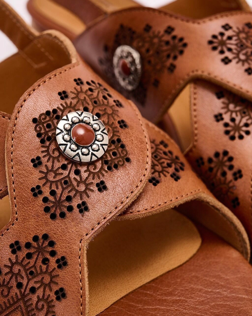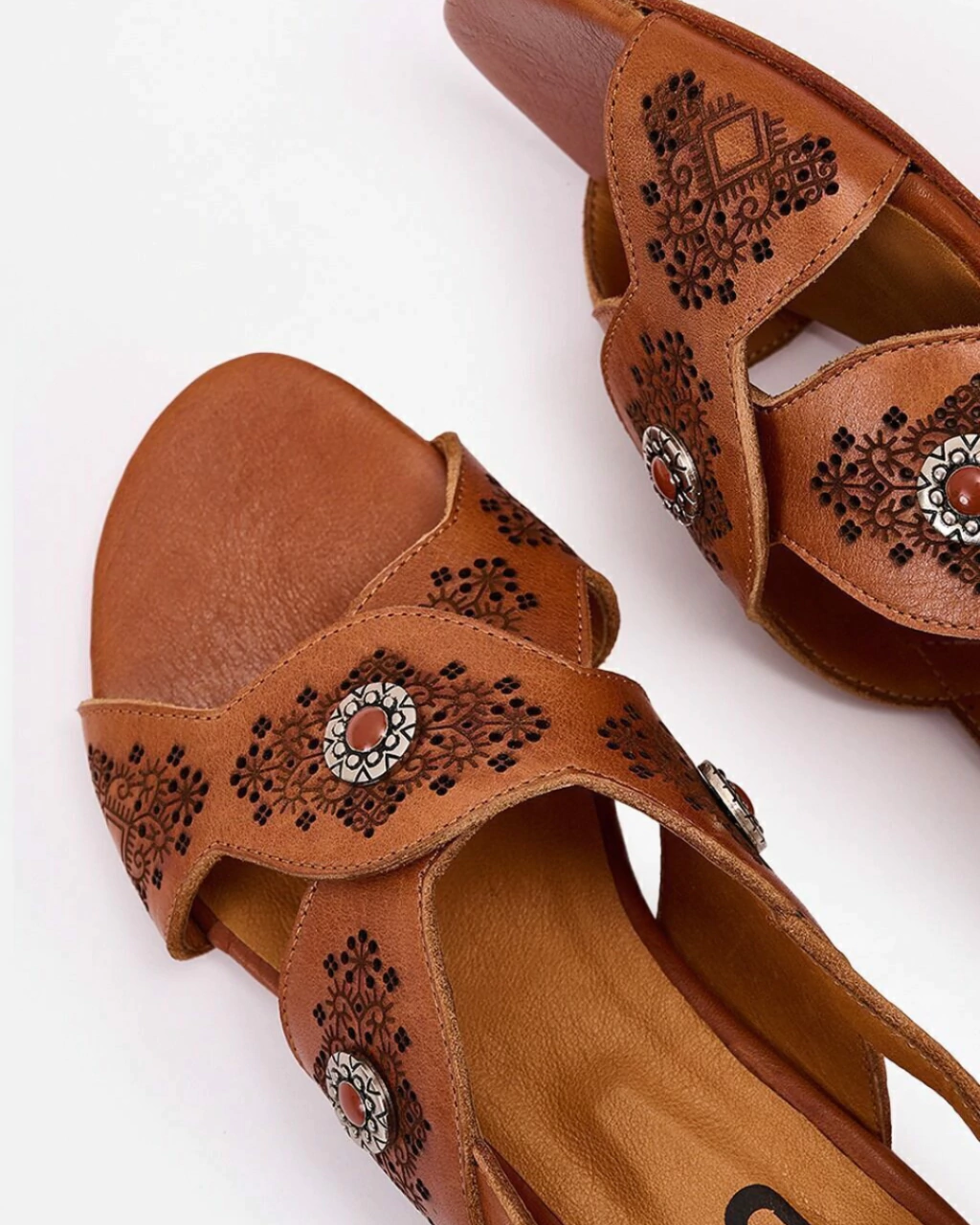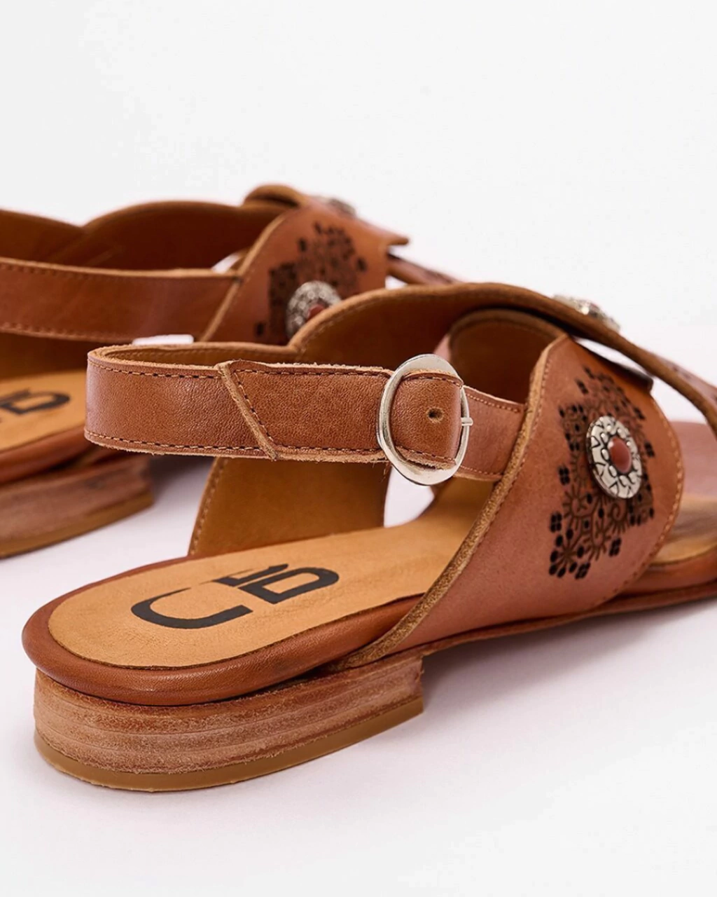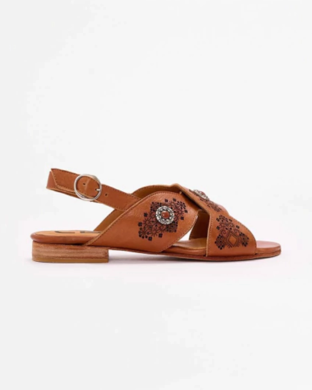 Sandalia de cuero vacuno con tiras cruzadas y calados hechos a mano, más herrajes metálicos que diseñamos especialmente para esta colección.