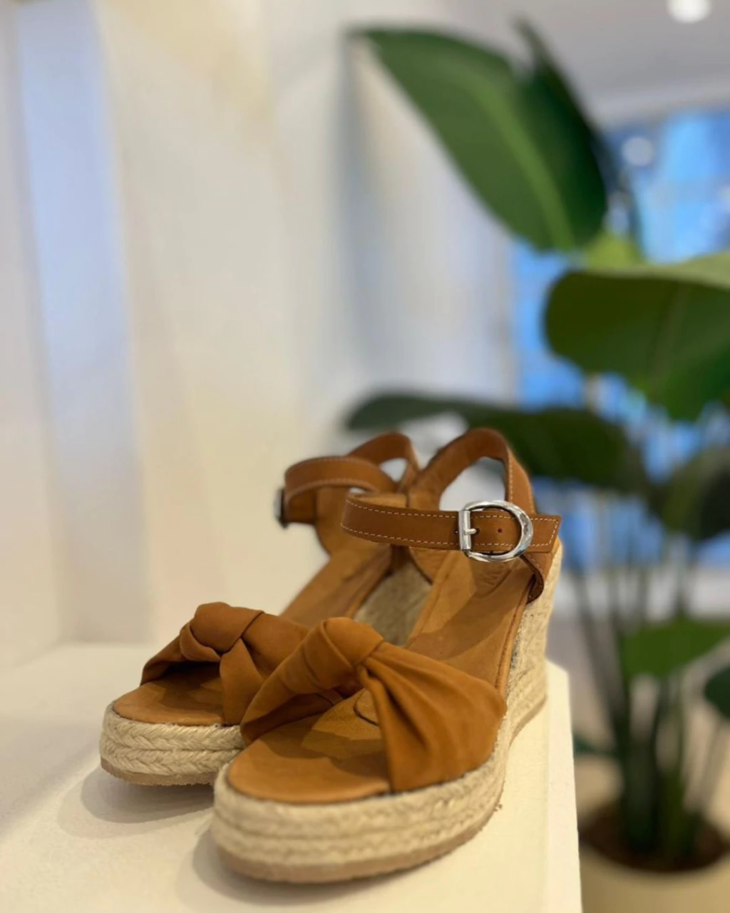 Sandalias confeccionadas en cuero natural, con diseño de moño frontal que aporta un detalle delicado y femenino. Cuentan con pulsera con hebilla regulable para un ajuste seguro. La base está forrada en rafia trenzada, logrando un estilo fresco y de temporada.