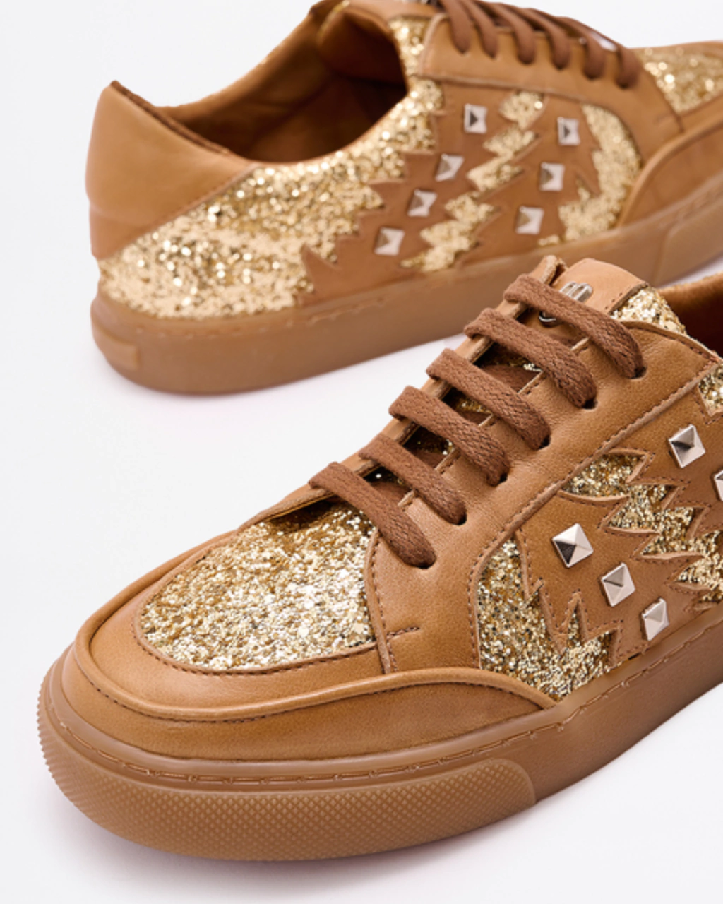 El glitter dorado se combina con cuero en tono suela y detalles de tachas piramidales que le dan un toque único.