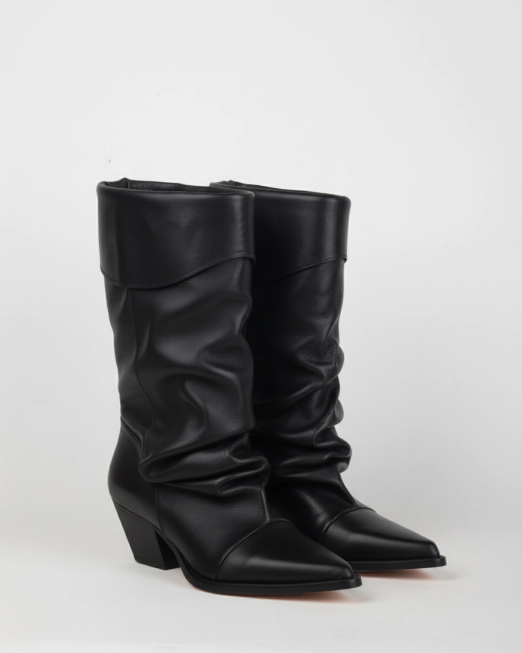 Estas botas de cuero con caña de 23.5 cm y taco ancho de 5.5 cm. tienen base de goma, punta fina y un diseño arrugado que se adapta bien a la pierna.