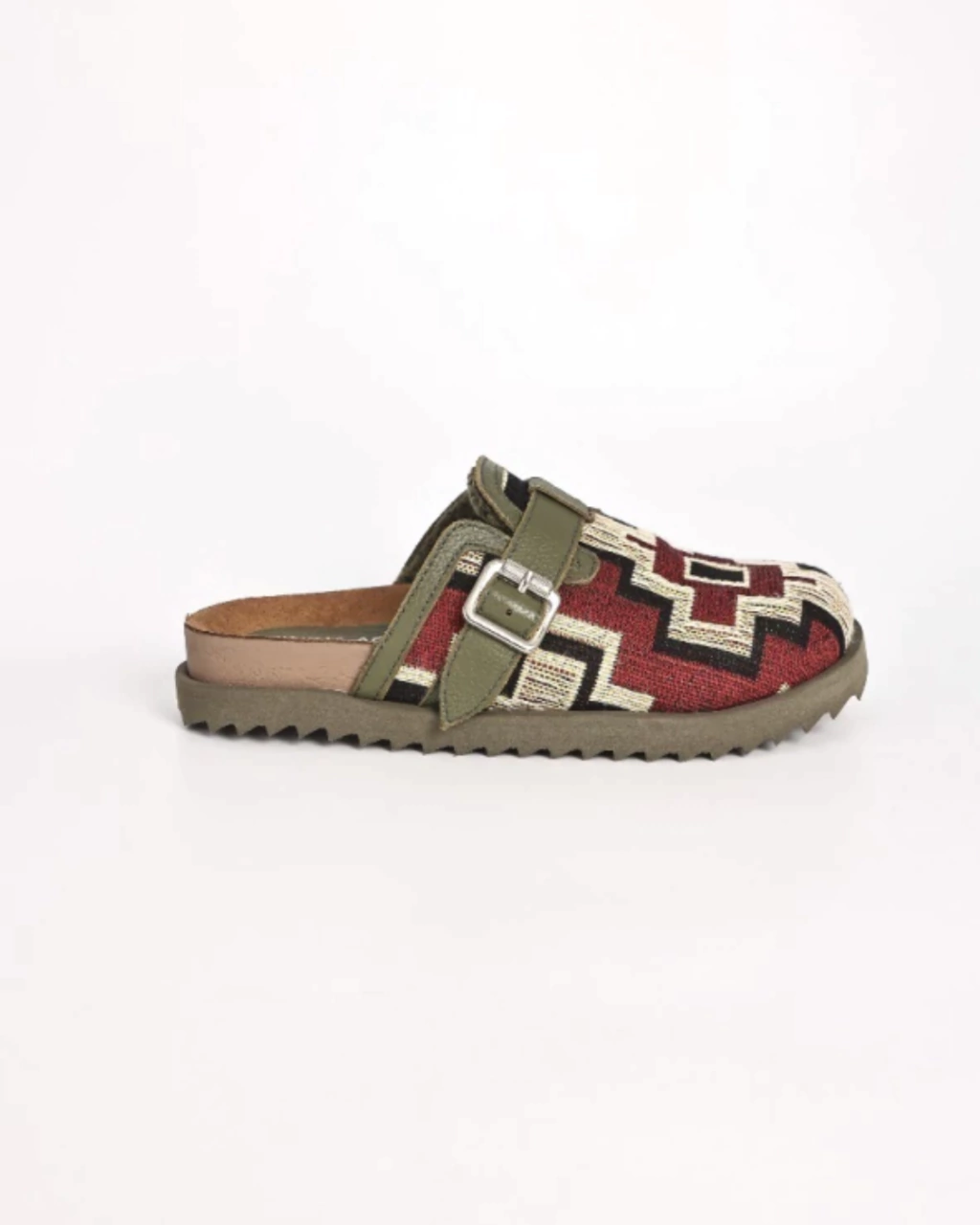 Estos zuecos combinan una textura de tela única con el interior forrado en cuero para mayor confort.